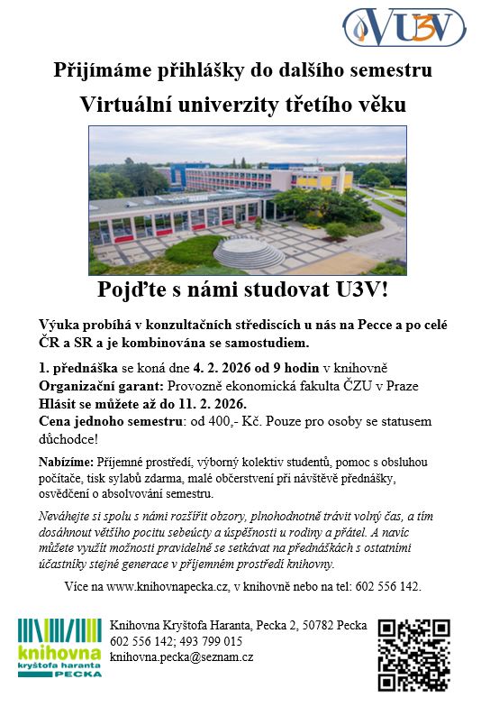 Neváhejte si spolu s námi rozšířit obzory, trávit plnohodnotně volný čas, dosáhnout většího pocitu sebeúcty a úspěšnosti u rodiny a přátel a využijte možnosti pravidelně se setkávat s ostatními účastníky stejné generace v příjemném prostředí knihovny.