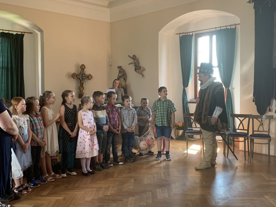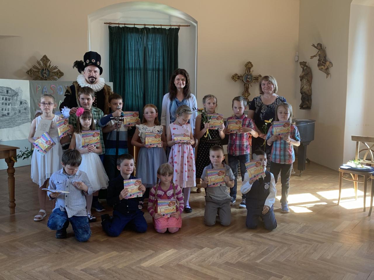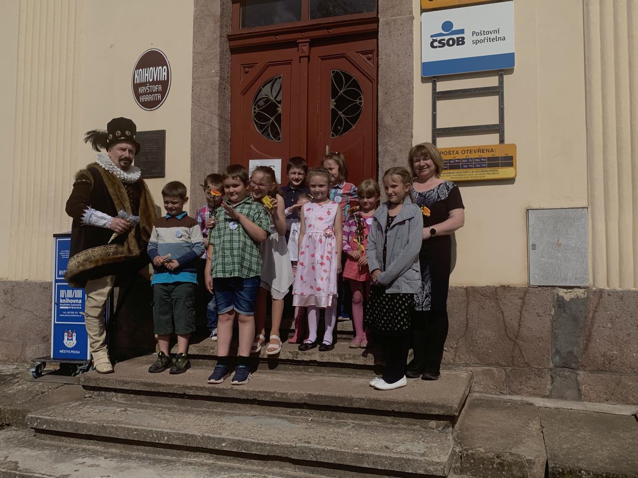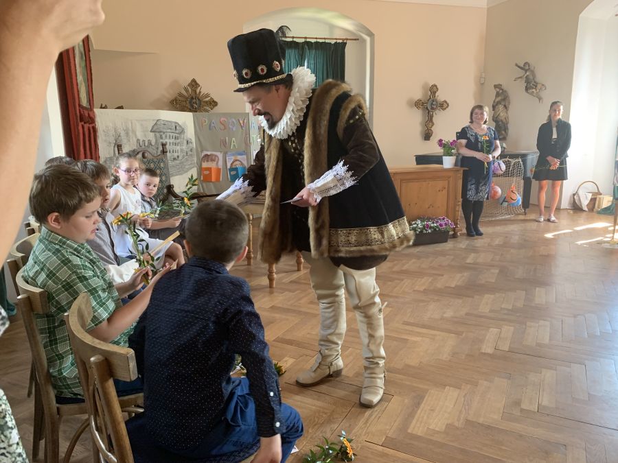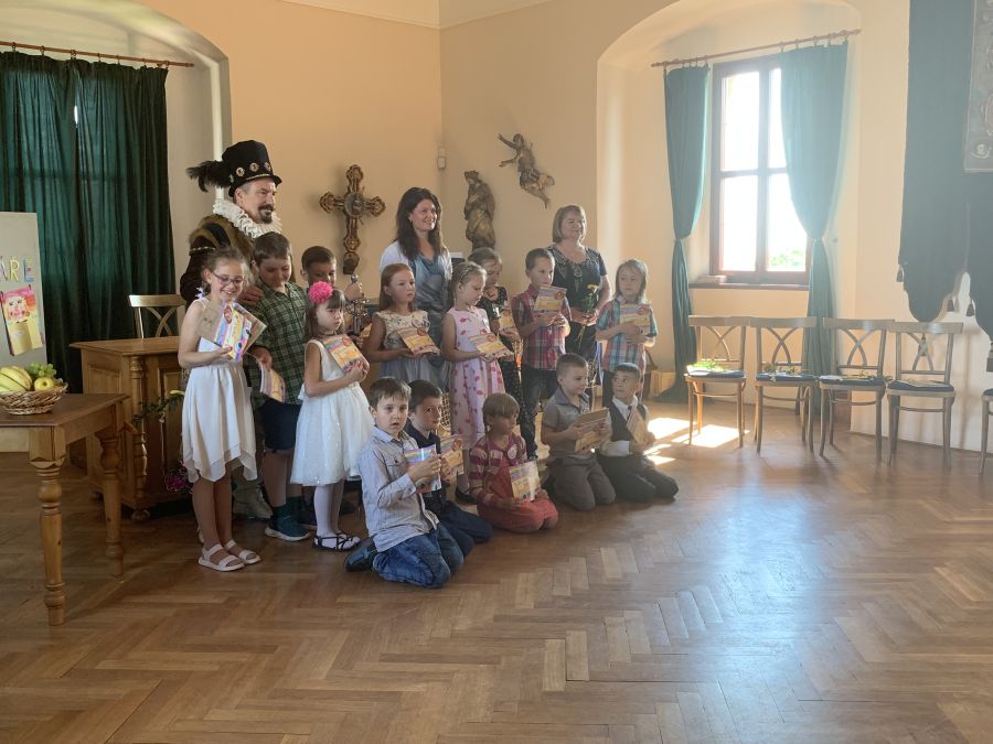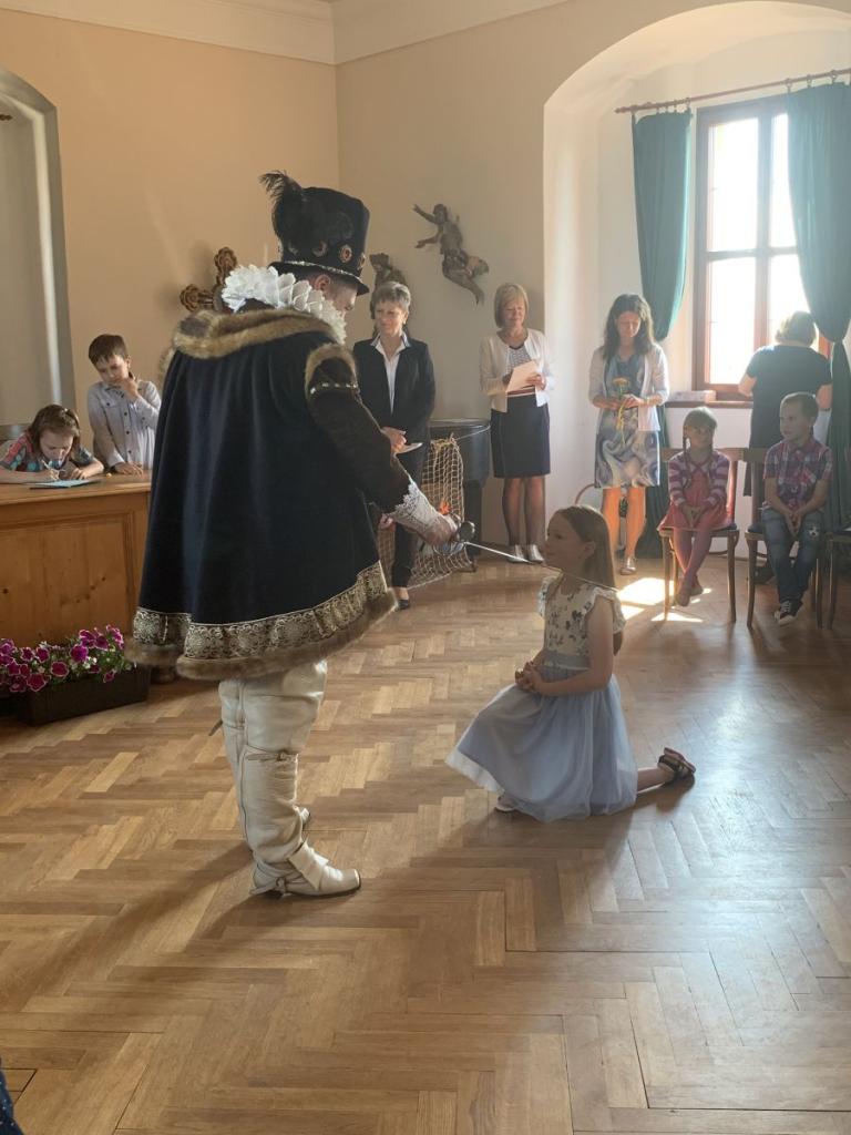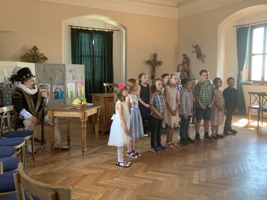 Dne 7.6.2024 bylo na hradě Pecka 14 našich prvňáčků slavnostně pasováno na čtenáře samotným Kryštofem Harantem.